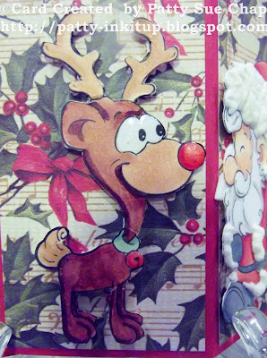I must say that I had a good time making this card but my goodness I need a refresher class in geometry! I don't know how many times I cut my paper with the wrong angle. I fussy cut all of the cute Christmas stamps from THE PAPER SHELTER  and placed them carefully on each panel. I do wish I had used a less busy print, but at this point I was happy to just have it facing the correct direction! I am the first to admit I am not adept at making shaped and gimmick cards. This was good practice for me. I created a belly band to hold my folds in place.
