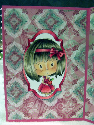 Oh! What fabulous coloring skills, Patty Sue! I love the highlights in her hair and ribbon, and then again, around her eyes and dress. Such a wonderful color combination, and really great background papers - contemporary, yet vintage! Pretty, and yet, cute! Wonderful creation! Hope your week-end is extra special! hugs, de